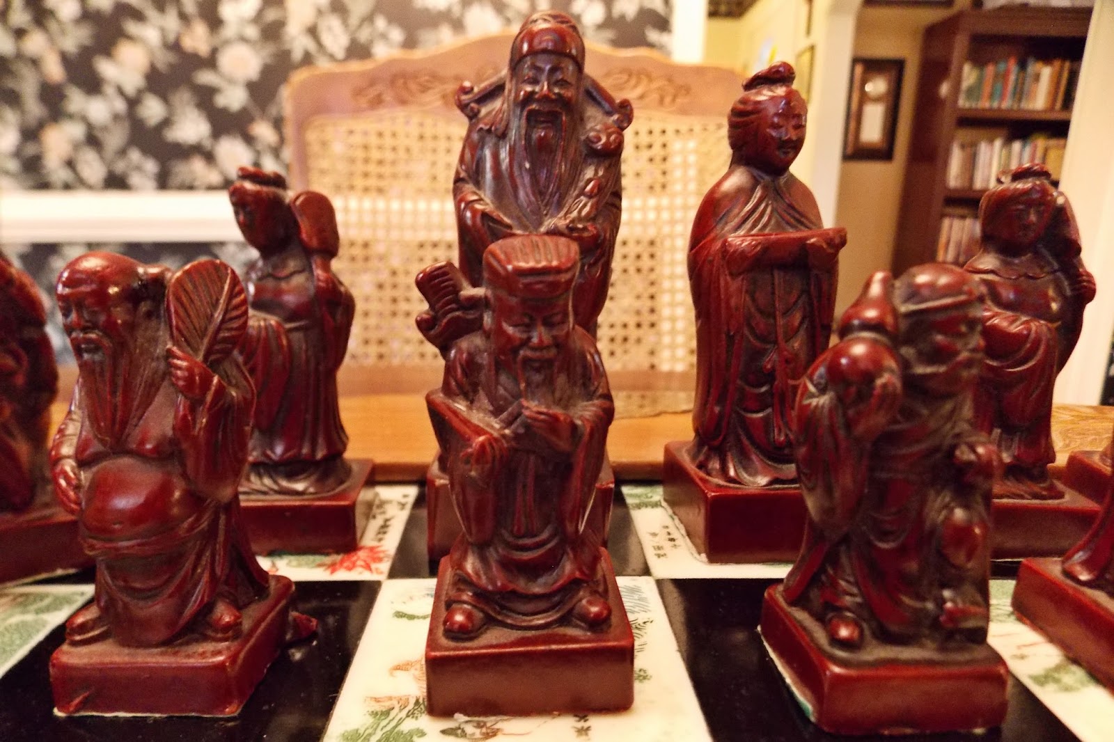 Yvonne bought this set for me when we were stationed in Hawaii. It is a Chinese set made from Soapstone. Each piece is a unique Chinese character. The case is carved and the board itself is inlaid with Chinese pictures.